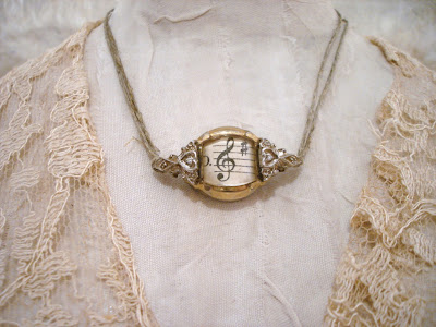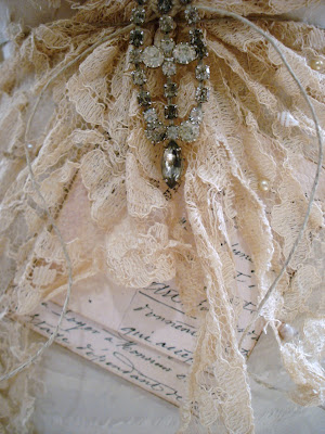 I've topped her with a wonderful old mason jar lid, embellished with the most beautiful piece of an old earring and a strip of a rhinestones. She wears a handmade necklace created from a beautiful old watch and inside is a snippet of sheet music!! Her sheath is a wisp of vintage lace accented by a gorgeous old earring and little pearls and shells that I've glued randomly on the skirt. I love the look of this French text and created two cards to hang around her waist. And lastly, I gently sprayed her white wings with a strong instant coffee solution and dried with my hair dryer!