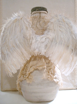 She stands approx 17 1/2" tall and her wingspan is about 12 1/2" wide. I had the most fun creating her! I used strips of muslin that I applied with matte gel medium. I didn't place them too randomly but adopted a pattern in different areas of her body.