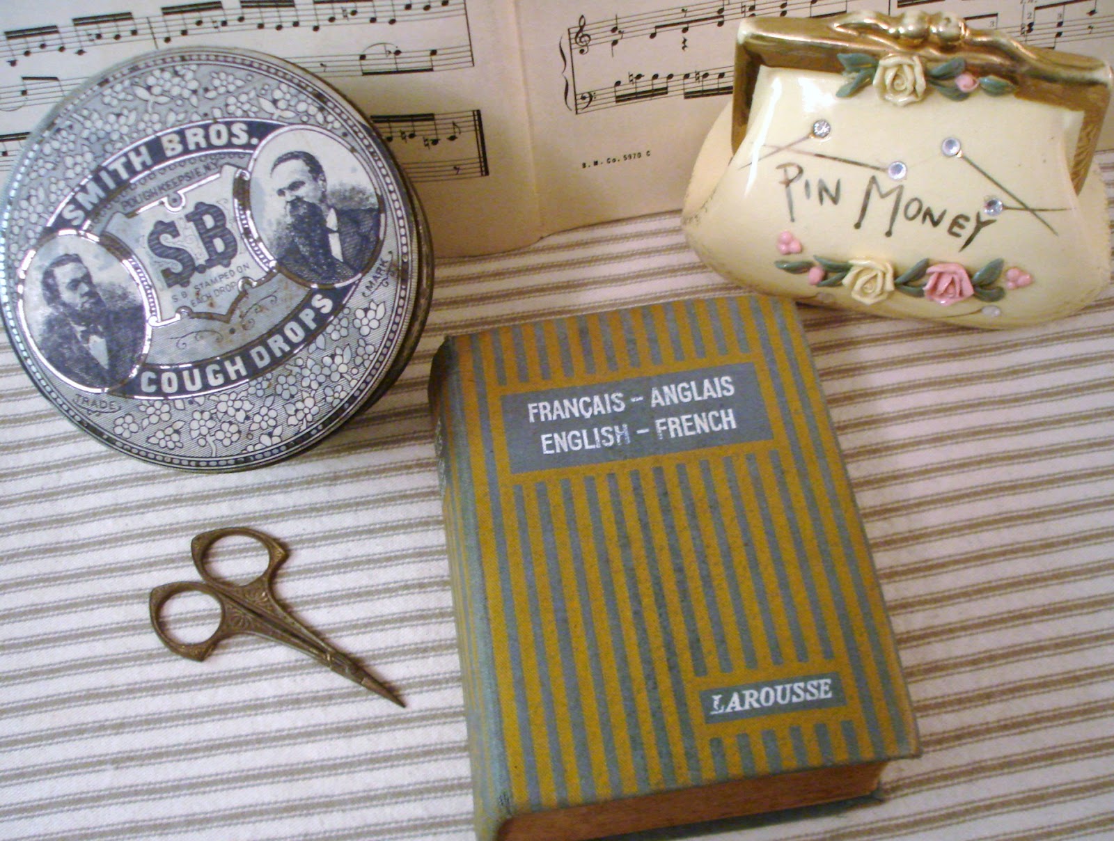 Lovely treasures you found! The pin bank was quite the find, but the little dictionary truly speaks to my heart. I'm absolutely sure it has been to France and back, at the very least in some sweet woman's hopeful daydreams. : ) It reminds me of the little Spanish grammar book I have. It belonged to my grandmother and is one of my treasures.