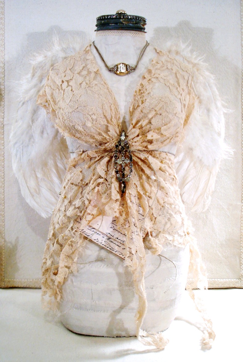 I used old lace, feather wings, rhinestones, etc.