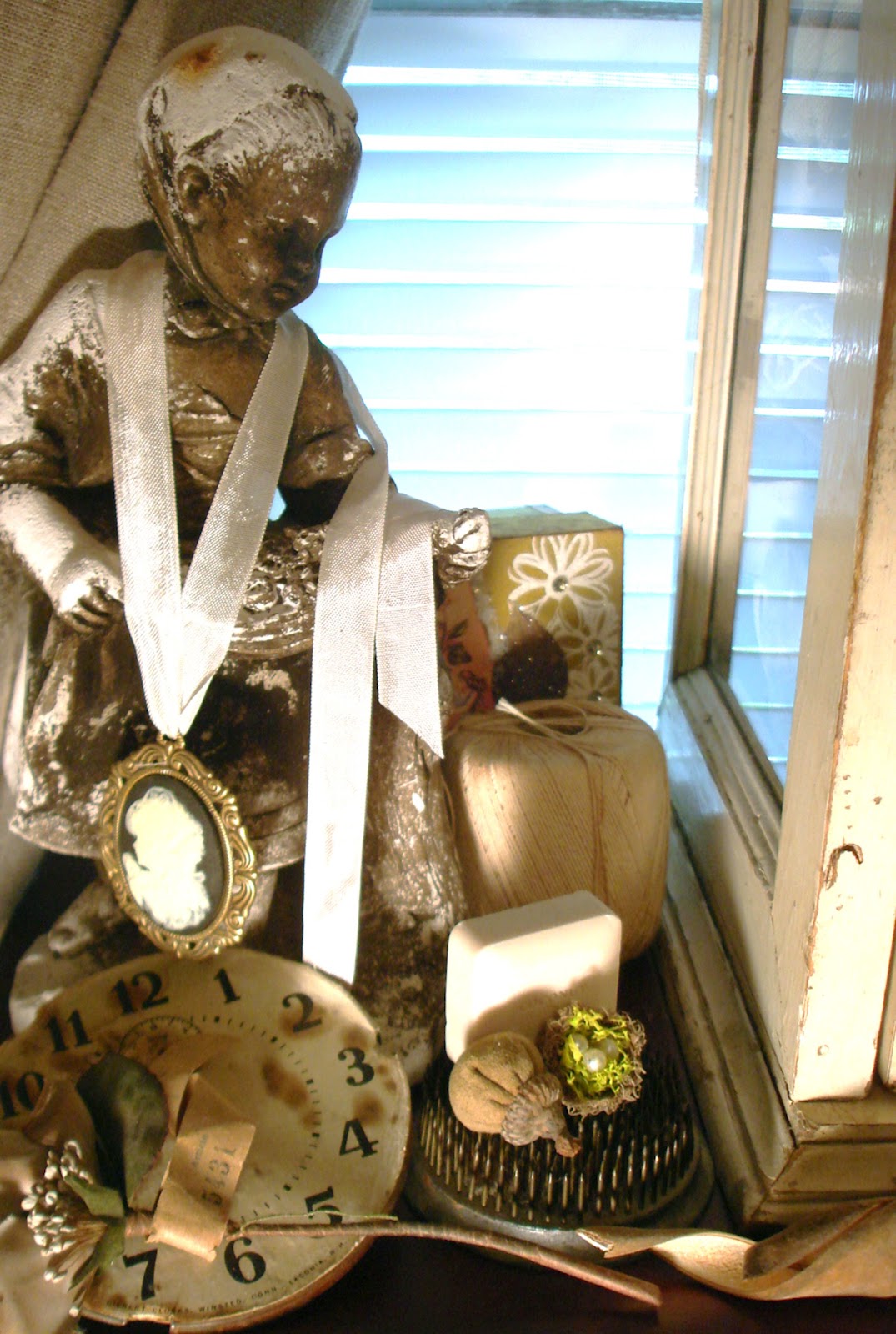 Oh Dawn, Dawn, Dawn! I wish I could see every beautiful thing in person. Your space is functional, but also SO PRETTY...I love how you have tucked sweet little vignettes into every nook and cranny. You have definitely surrounded yourself with with inspiring treasures! The assemblage you created, hanging by the wedding dress, with the little coin purse is soooo wonderful.