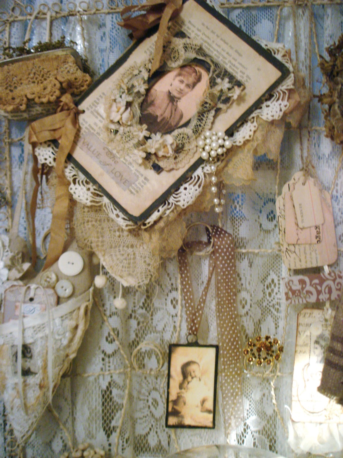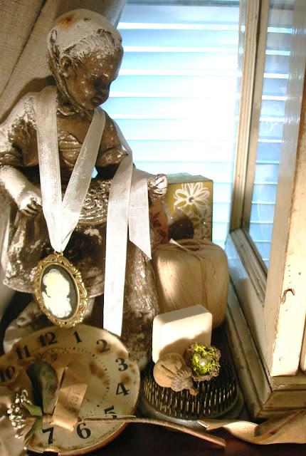 My gosh!!! SO pretty... Love all the buttons, laces, and baby shoes! It was so much fun to look through all the beautiful goodies and treasures to be found here!! Thanks for sharing your creative space, and hope you're enjoying the weekend! ~tina