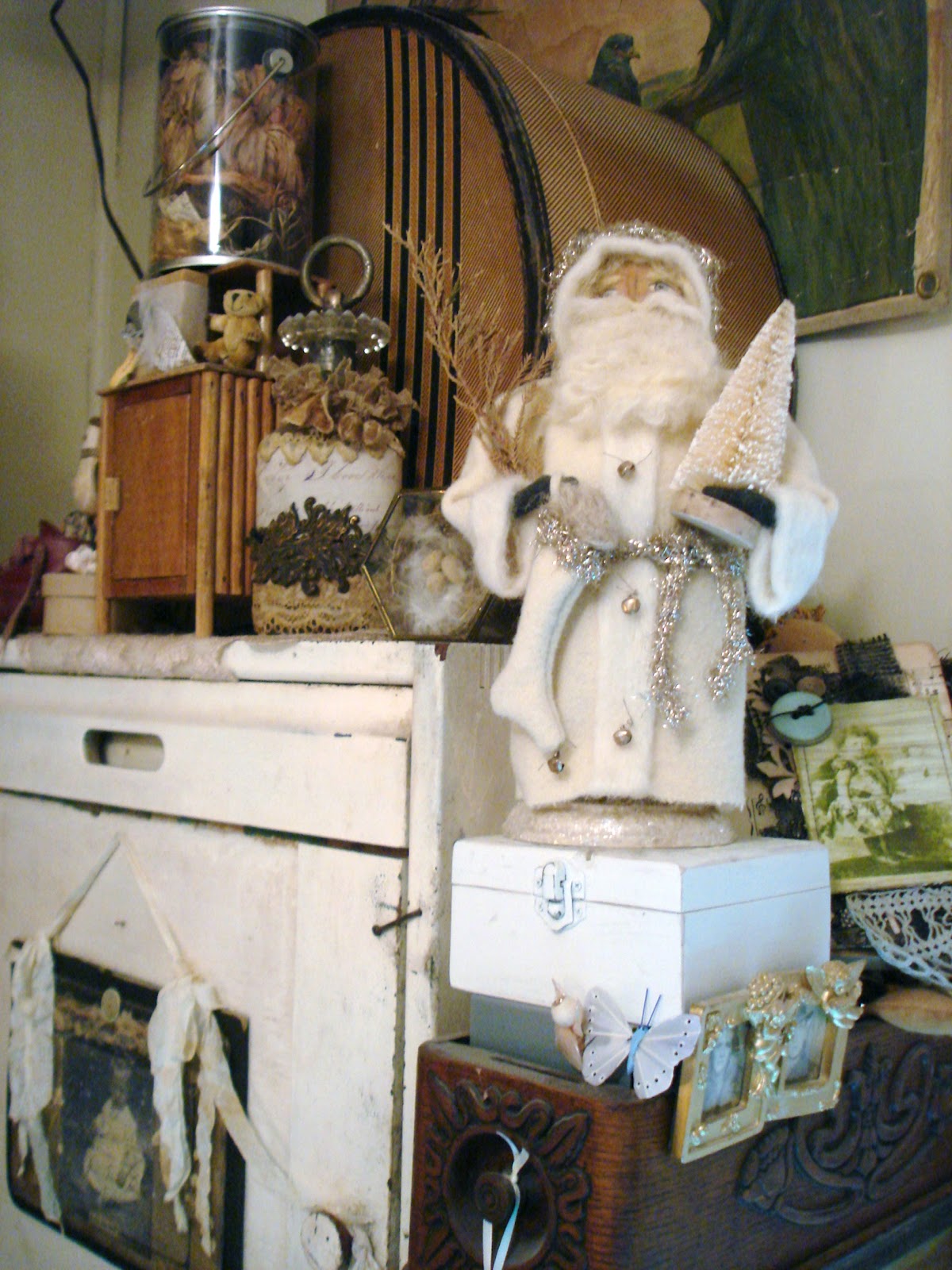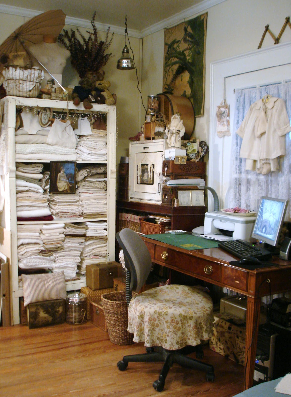 I adore your room and collections of treasures. I remember when you moved to that house and were challenged with a smaller studio. You rocked it! Love those framed collages with some of your treasures under glass. Thank you for sharing!
