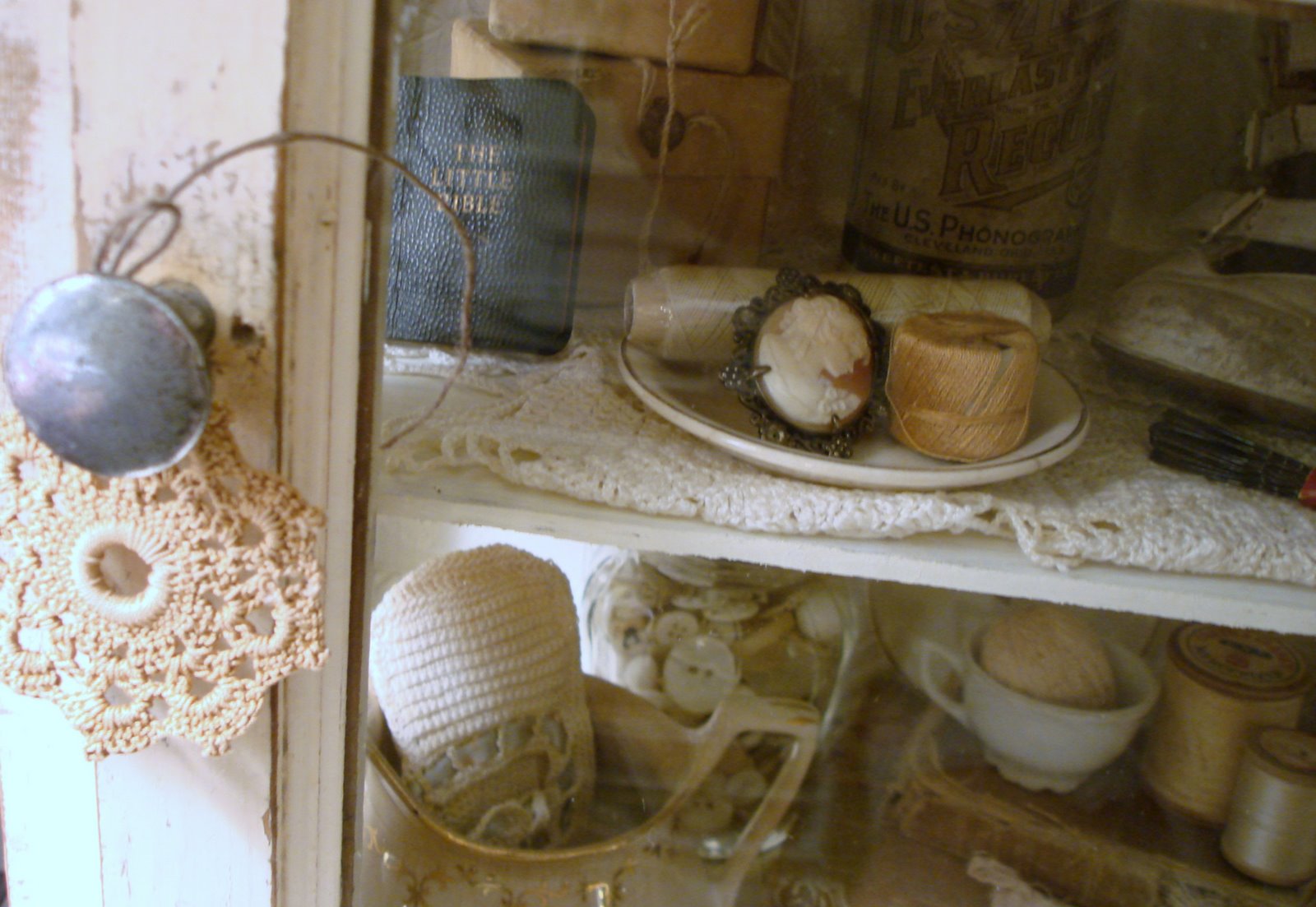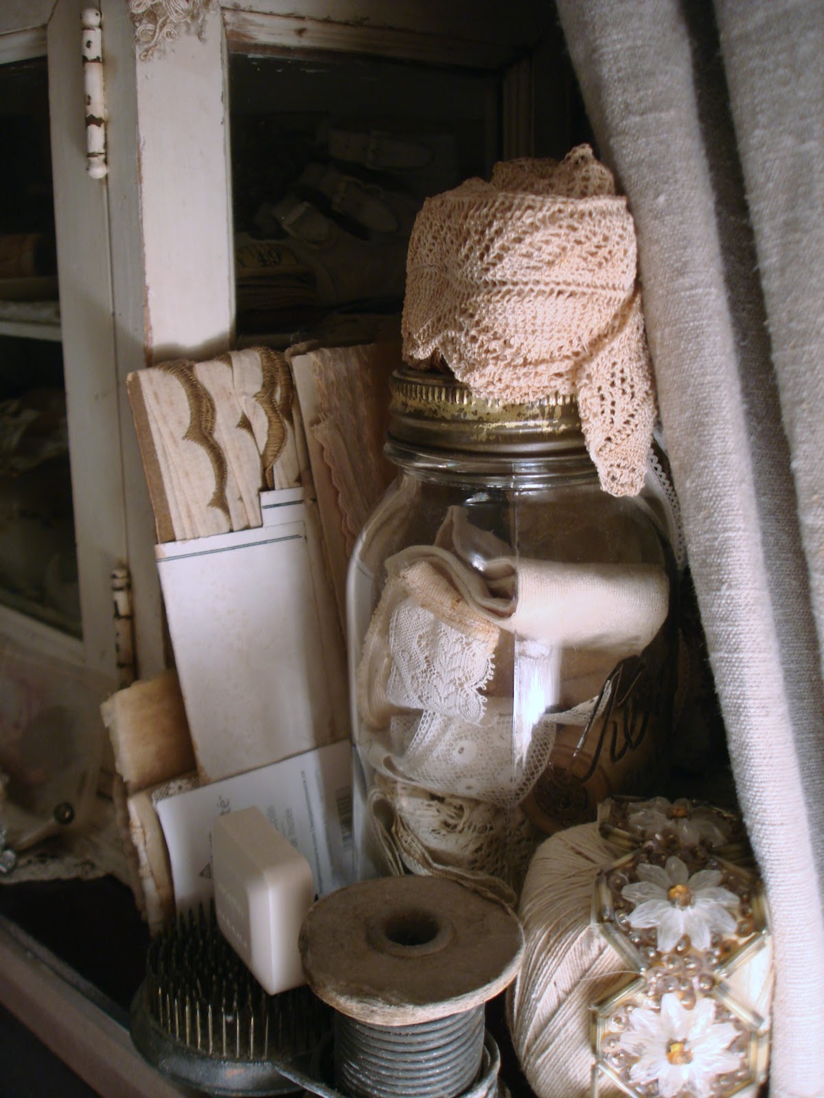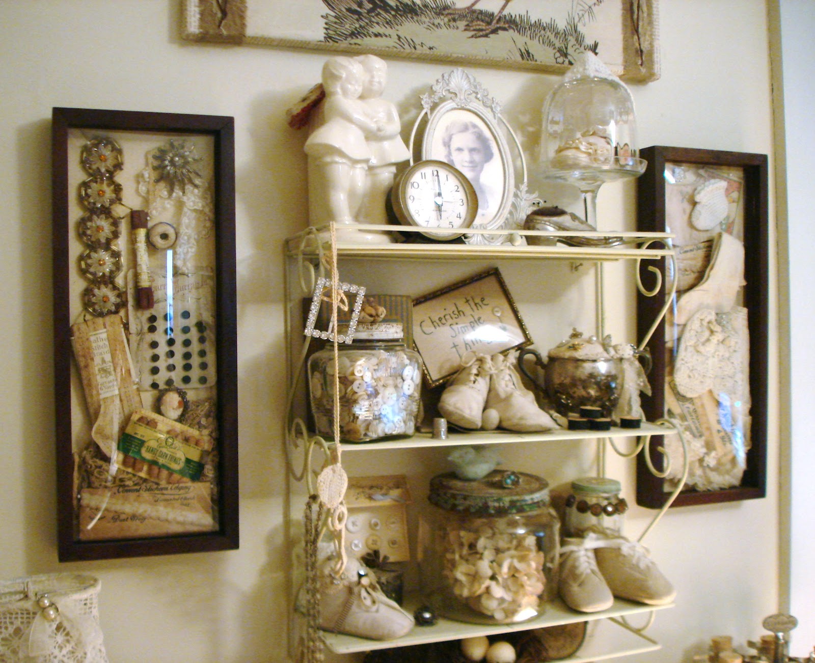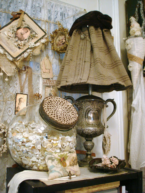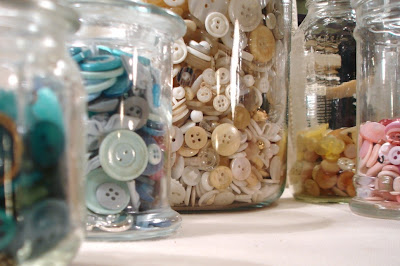 Good Gravy! I could shop out of your space to fill mine! Love all the buttons especially the big jar with the doily on top!