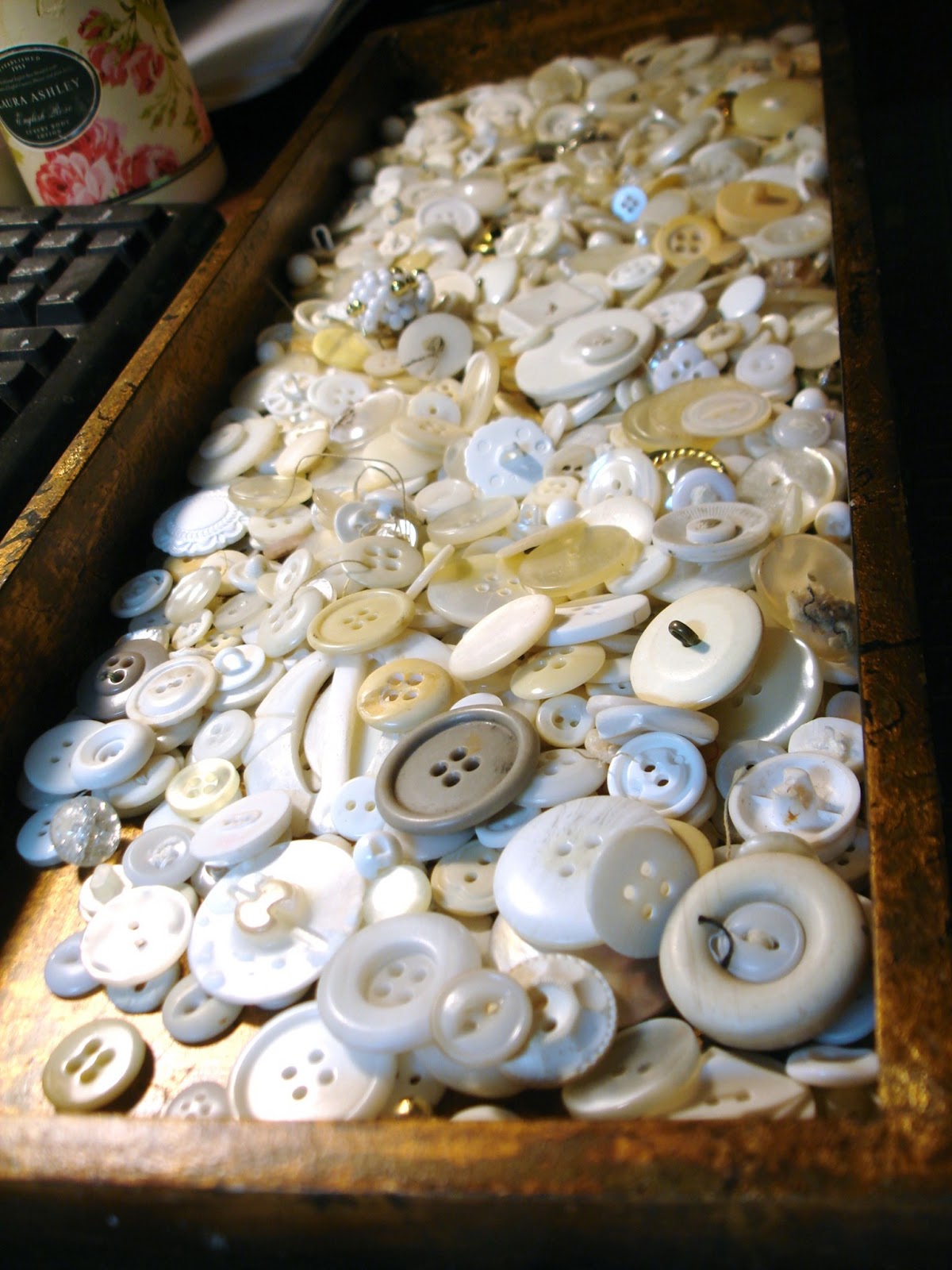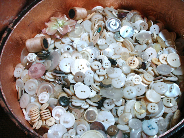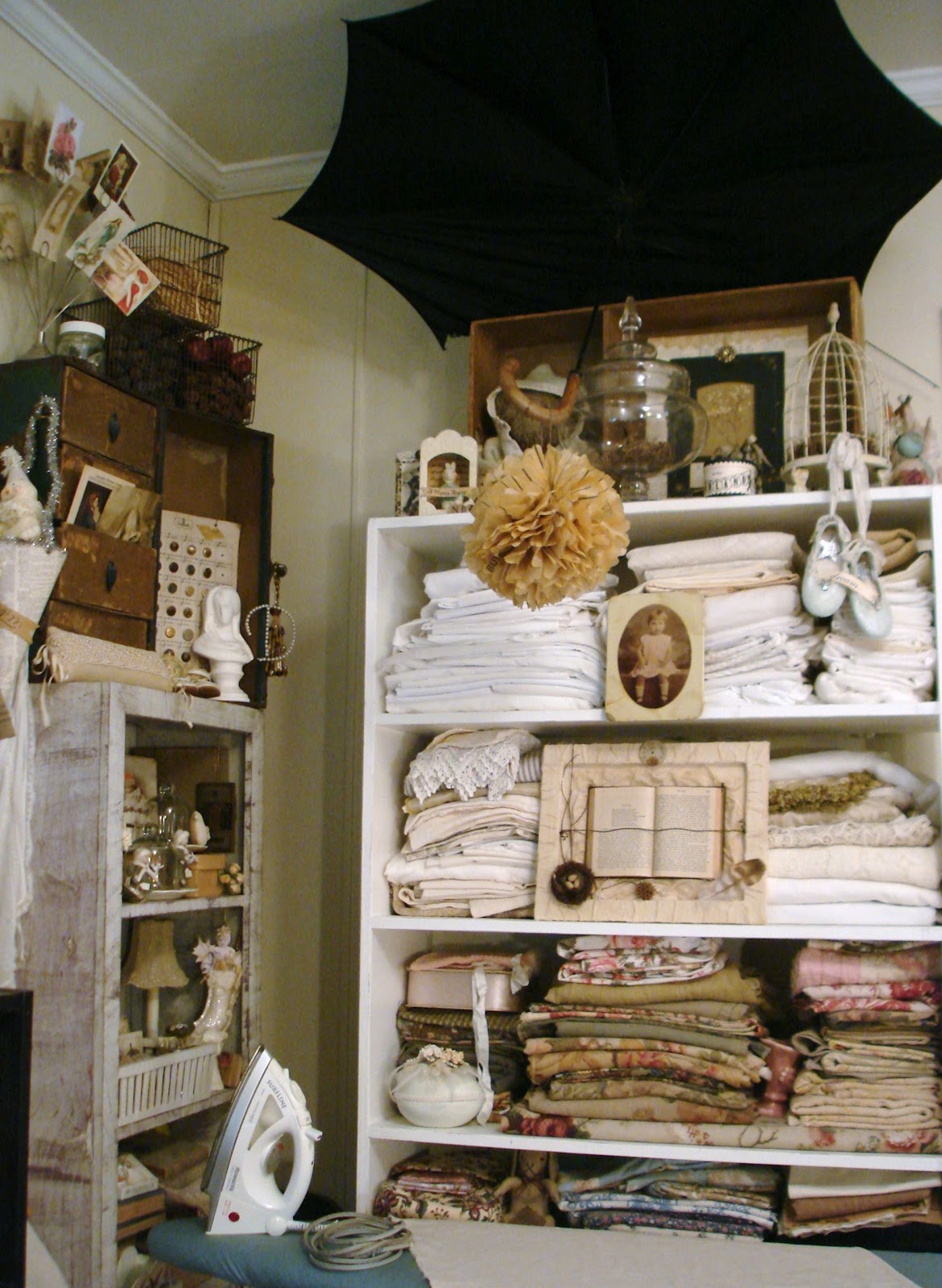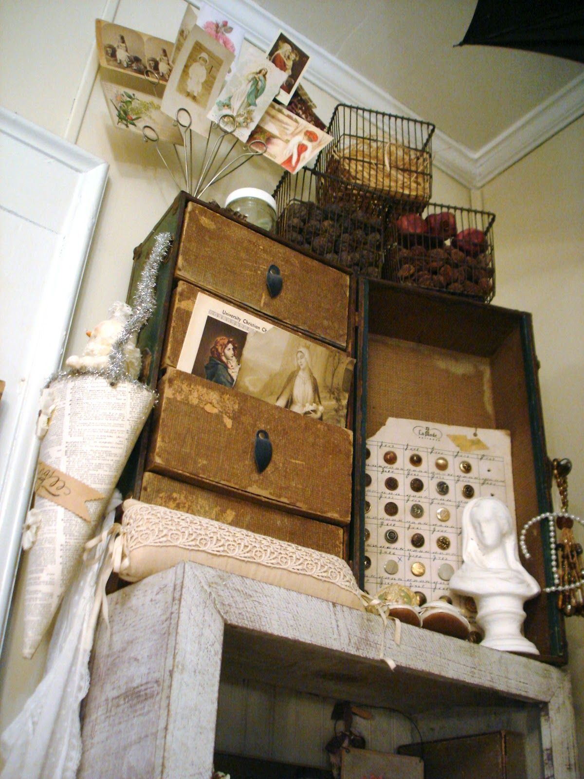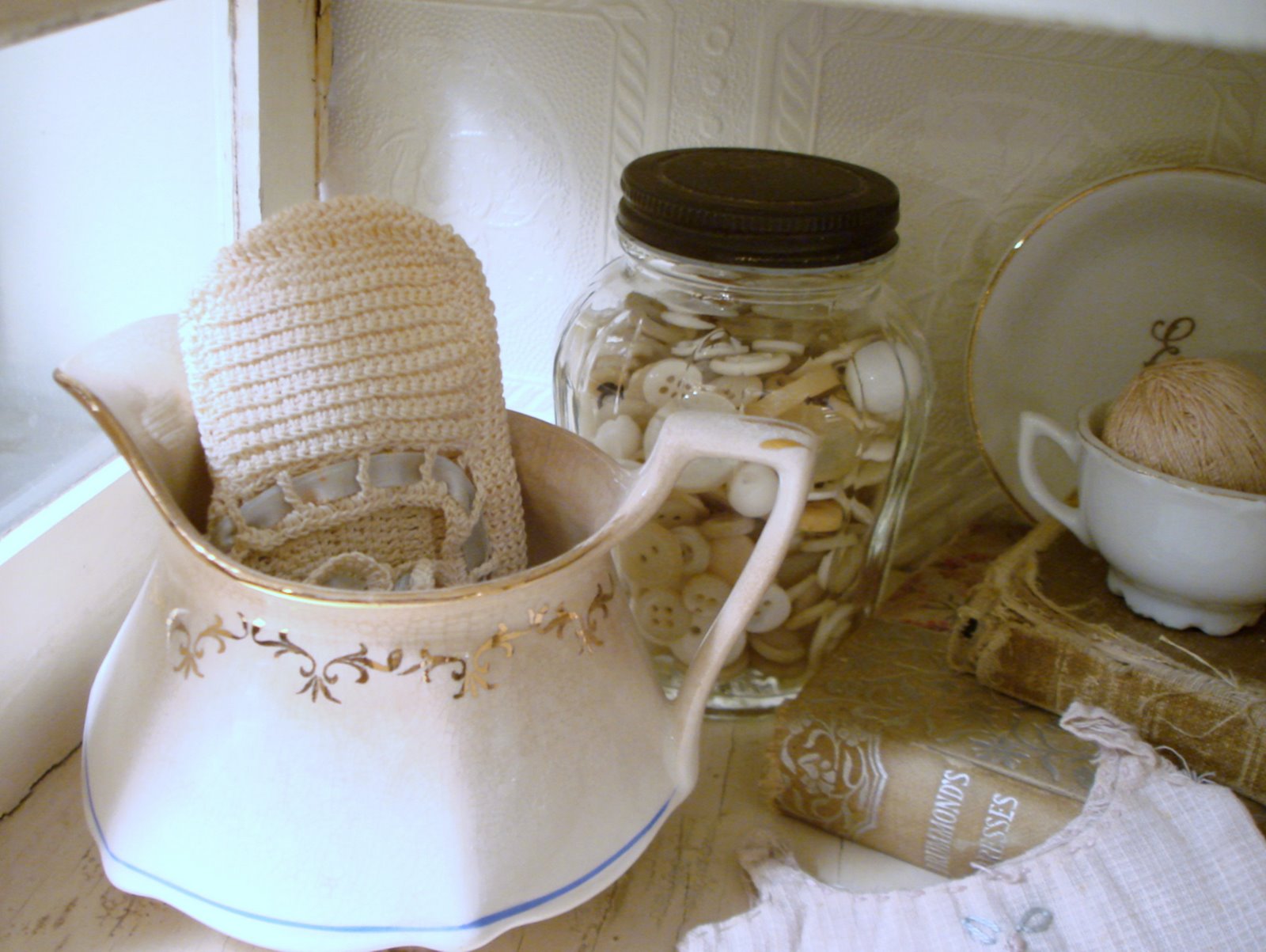 Good Gravy! I could shop out of your space to fill mine! Love all the buttons especially the big jar with the doily on top!