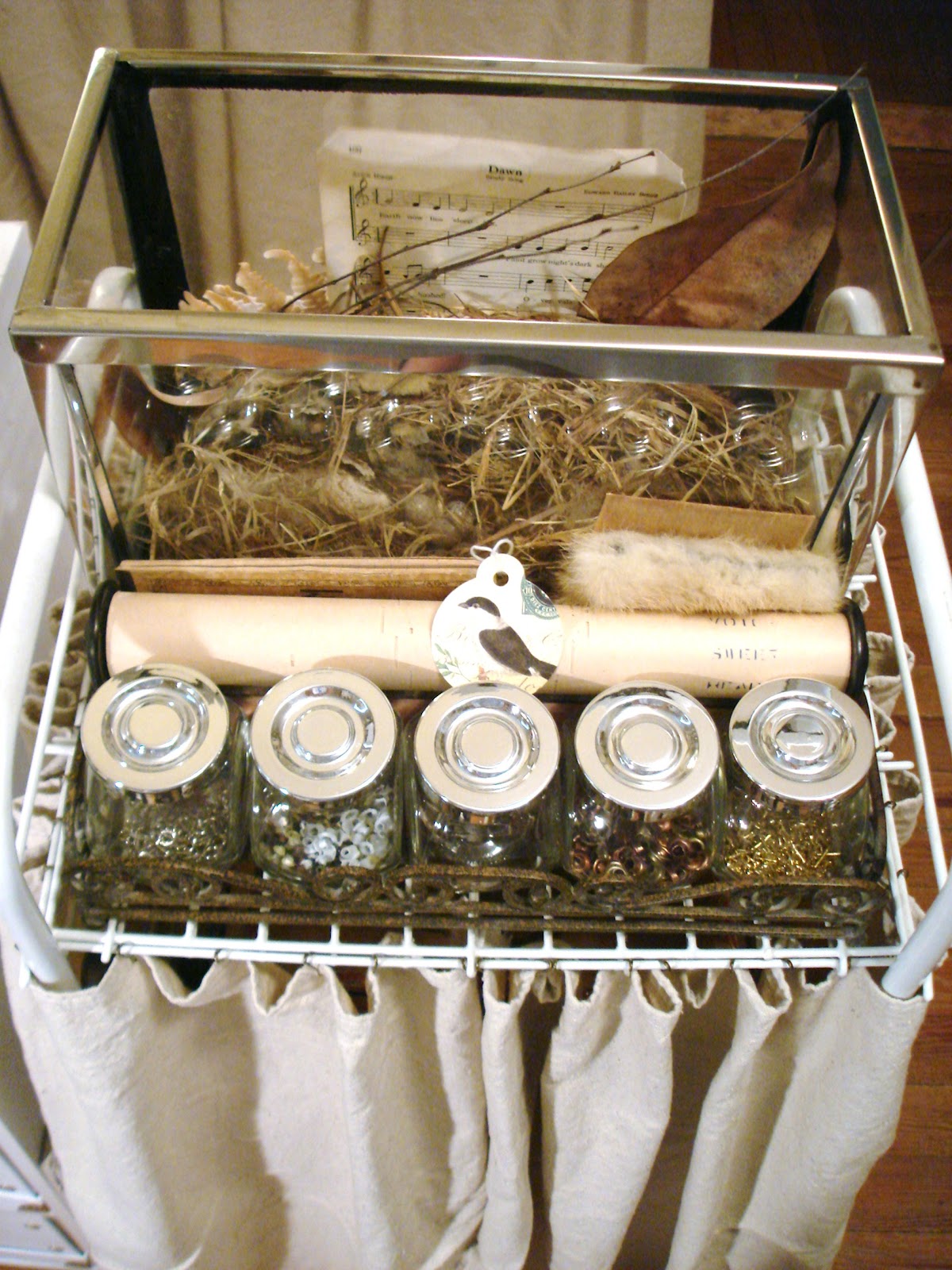 Such a great space, Dawn! Skirting tables is the best, isn't it? It looks pretty and hides lots more goodies! I love that huge canister of buttons. I just bought a bunch on Etsy recently and I have to sort through them. You're right ~ separating the colors makes it easier to find what you're looking for. I can just imagine you in here creating your beautiful sachets or pulling things together for one of your collages!