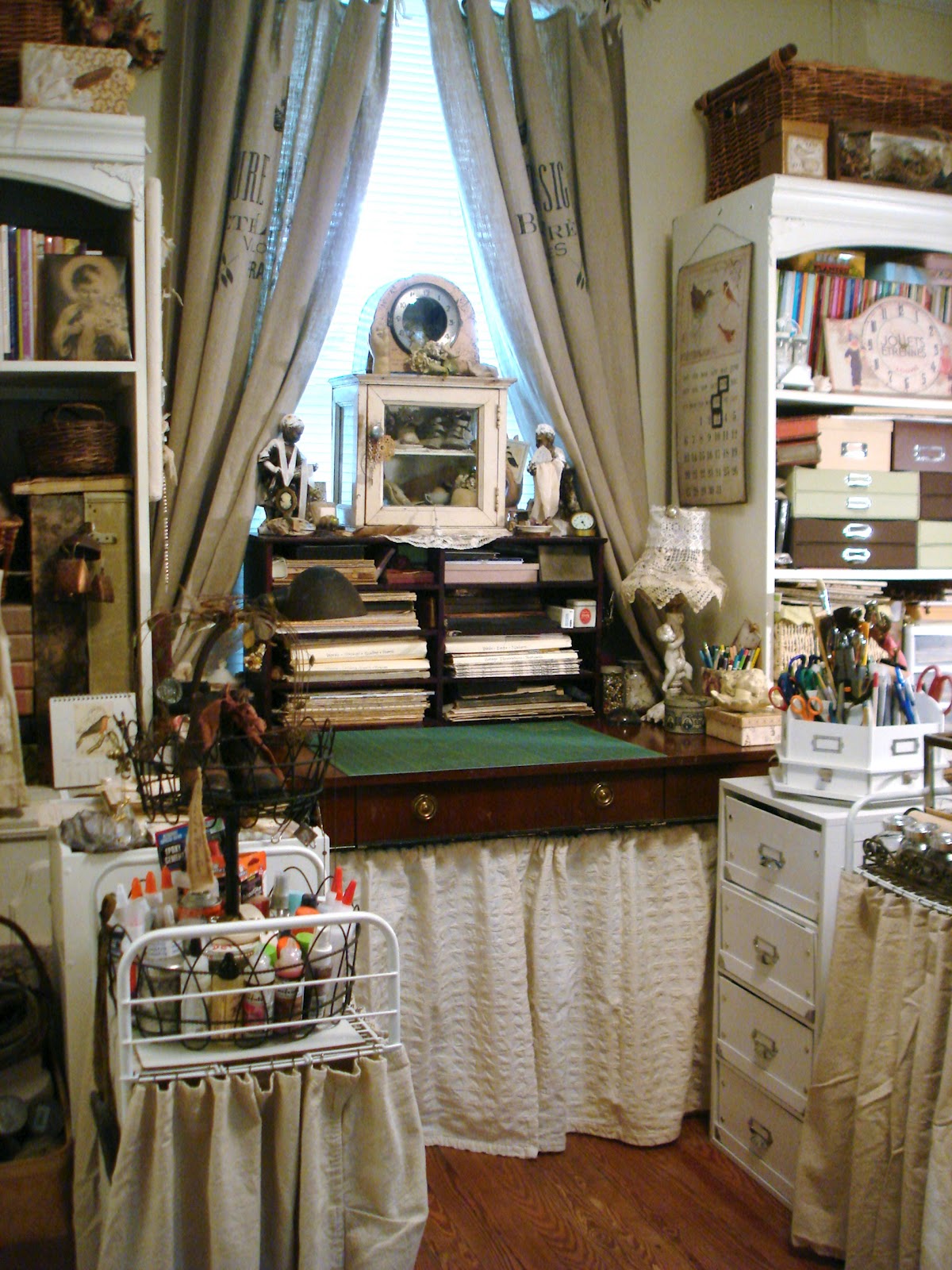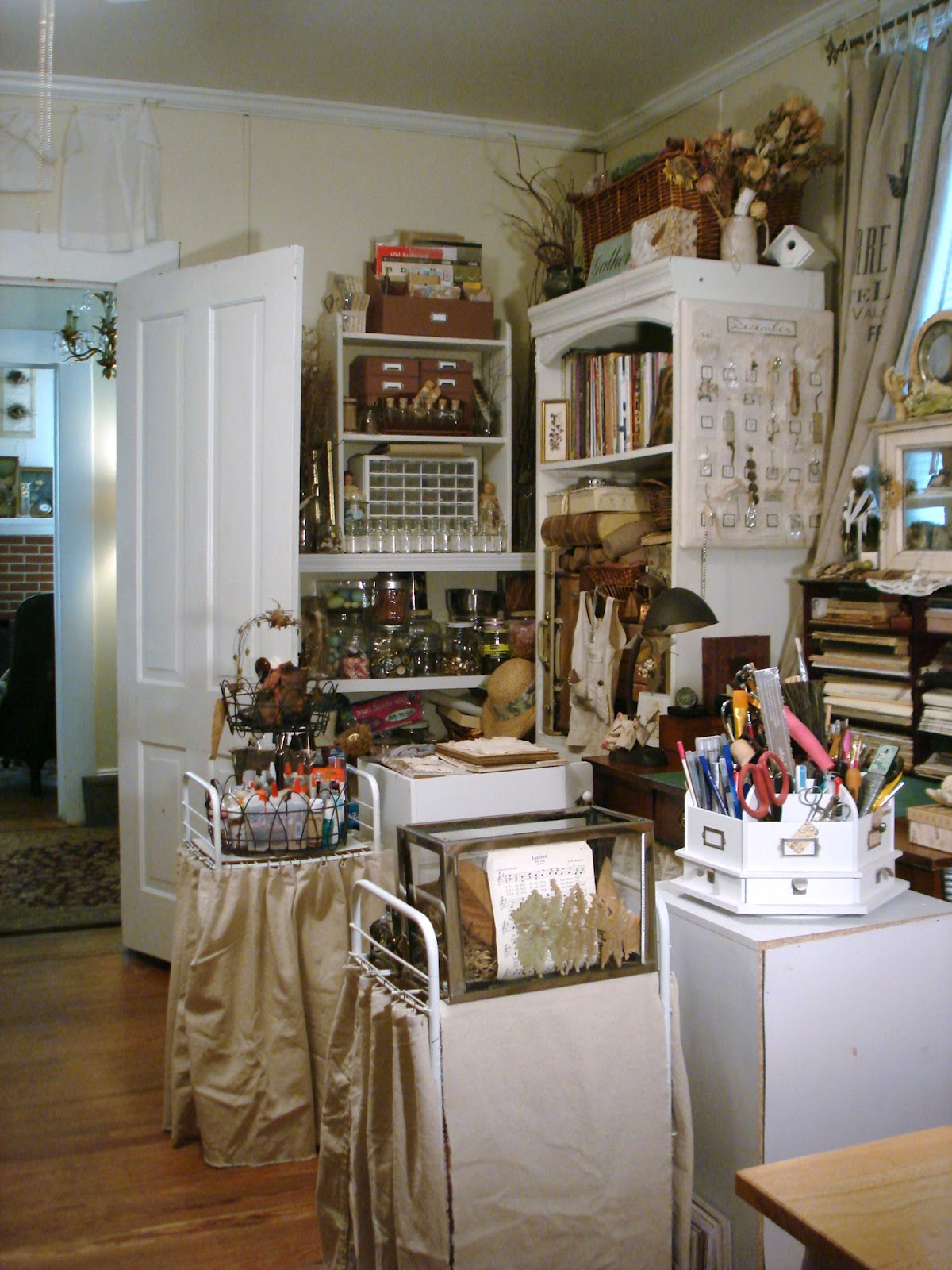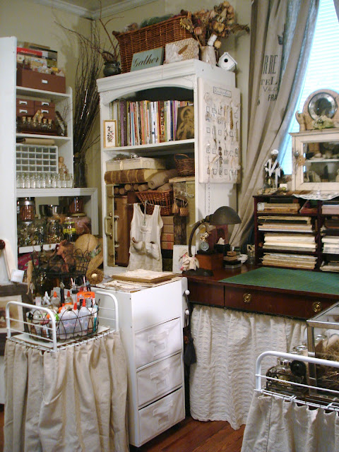 Dawn, your studio is dreamy! I love all the cream and white supplies. I also like how you used the fabric "curtains" to conceal the wire carts. What a great idea! I have to go back and study the pictures again.