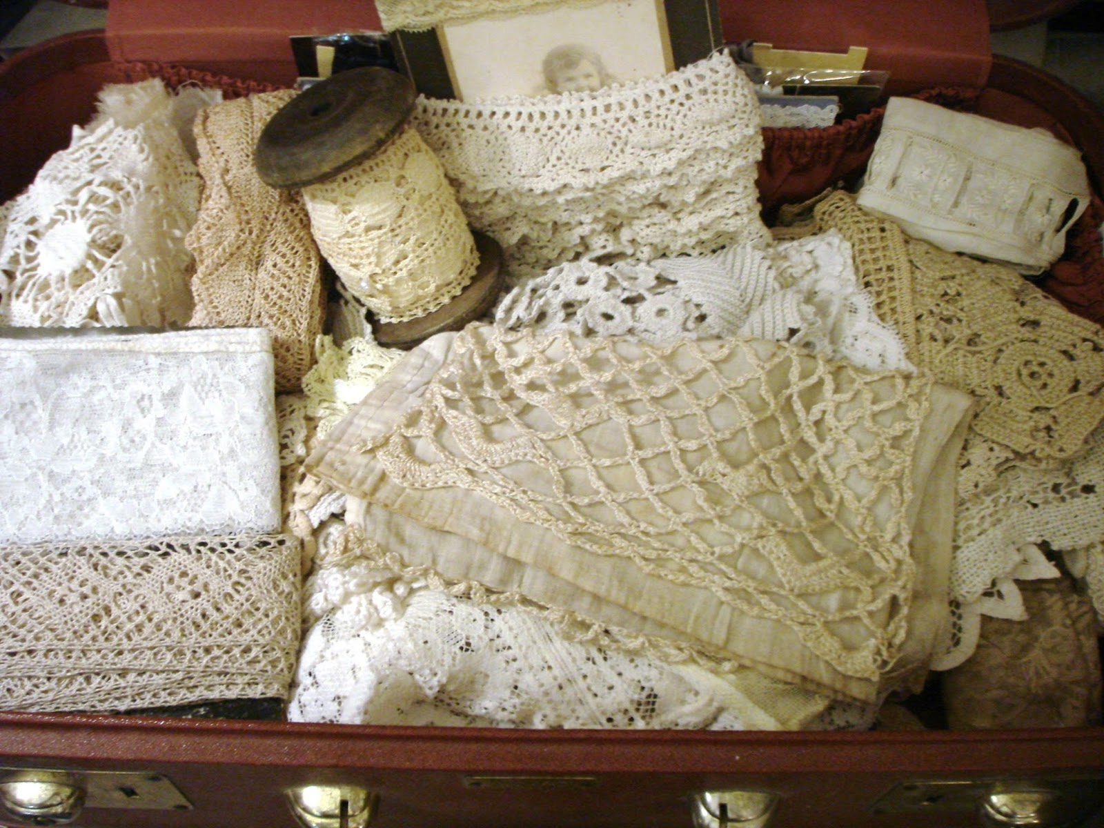 I so love all the old laces, and wonderful fabrics- and oh your organised suitcage -what yummyness !