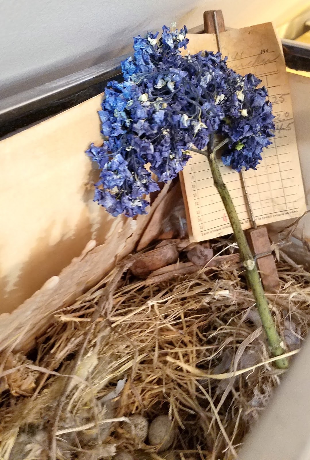 Another dried hydrangea bloom resting in an antique aquarium with a bird's nest.