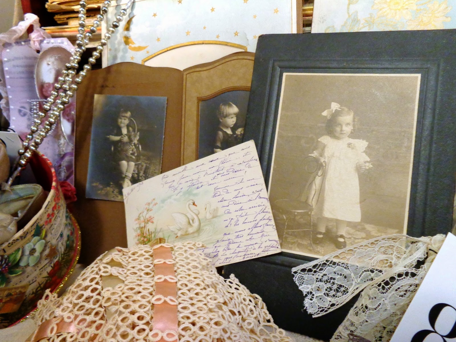 Antique children's photographs and old photo album pages.