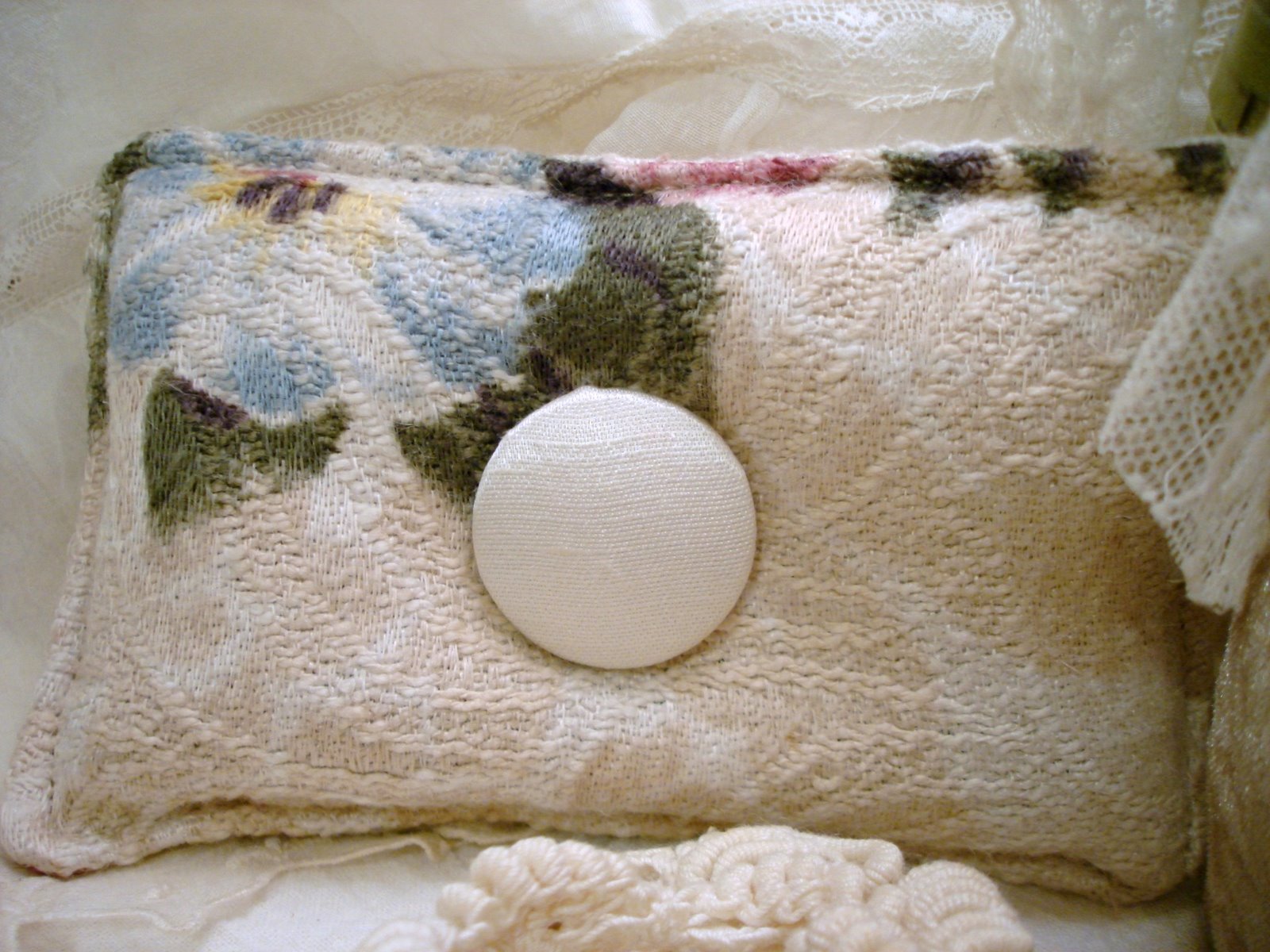 I made my own covered button for this sachet out of a old embroidered linen....