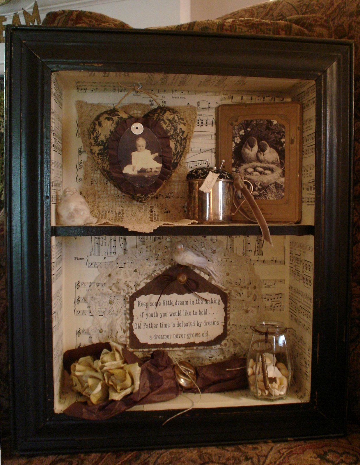 The more I work on the yard sale and go through items, I tend to take the smaller items that I know I want to keep to my artroom. Well, by day's end, it had gotten pretty rough looking. I starting straightening a bit and as I finished I started putting a few small items into a grouping that are so sweet to me . . .