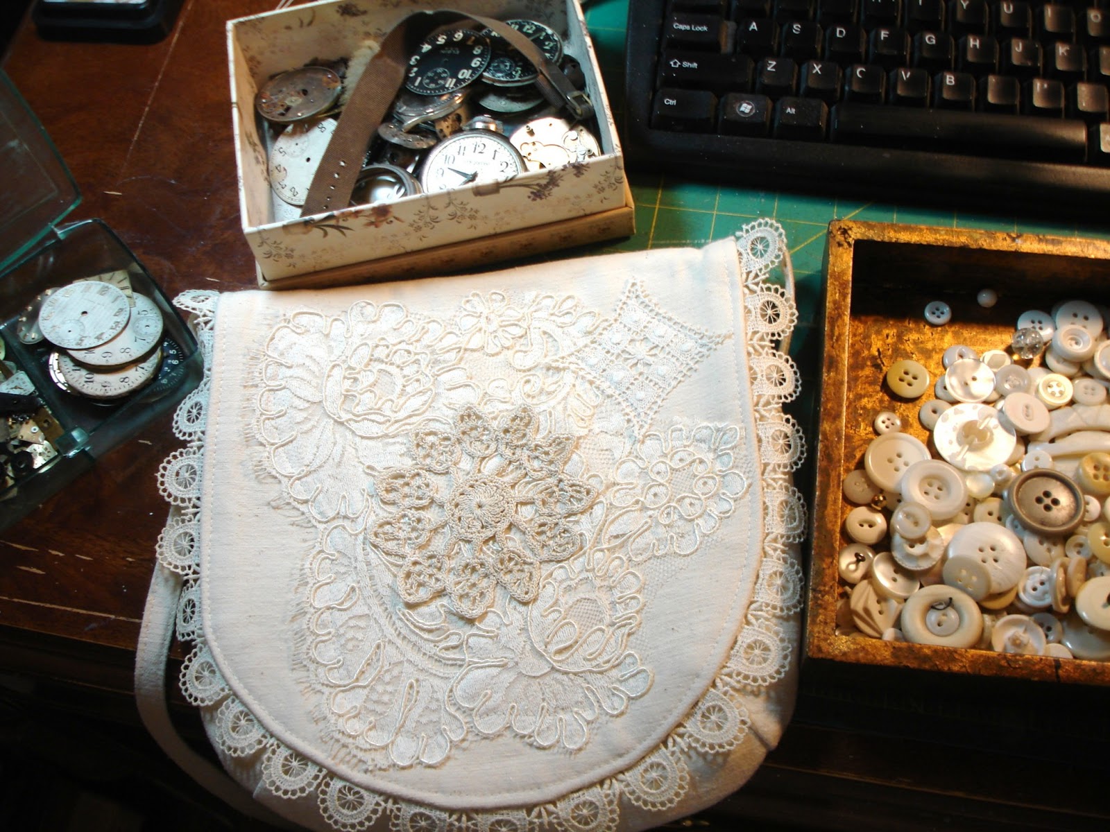 gorgeous old lace, vintage buttons and a random watch face of course!