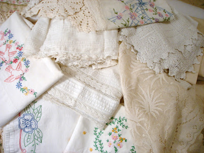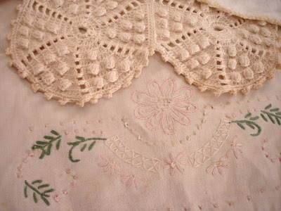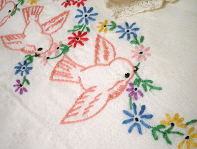 This old pillowcase is stained quite bad but the stitchery is so pretty ~ and look at the pink birds!! I've used these edges as flaps on pillows that I've sewn before. Or maybe transformed into a lavender sachet?